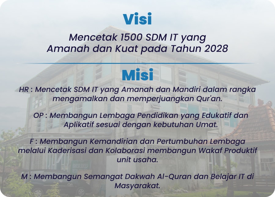 " Pondok IT adalah tempat belajar ilmu IT memadukan ilmu agama terbaik di Yogyakarta. Visinya sangat jelas, sukses di dunia sebagai seorang profesional dan sukses di akhirat sebagai seorang muslim yang taat "